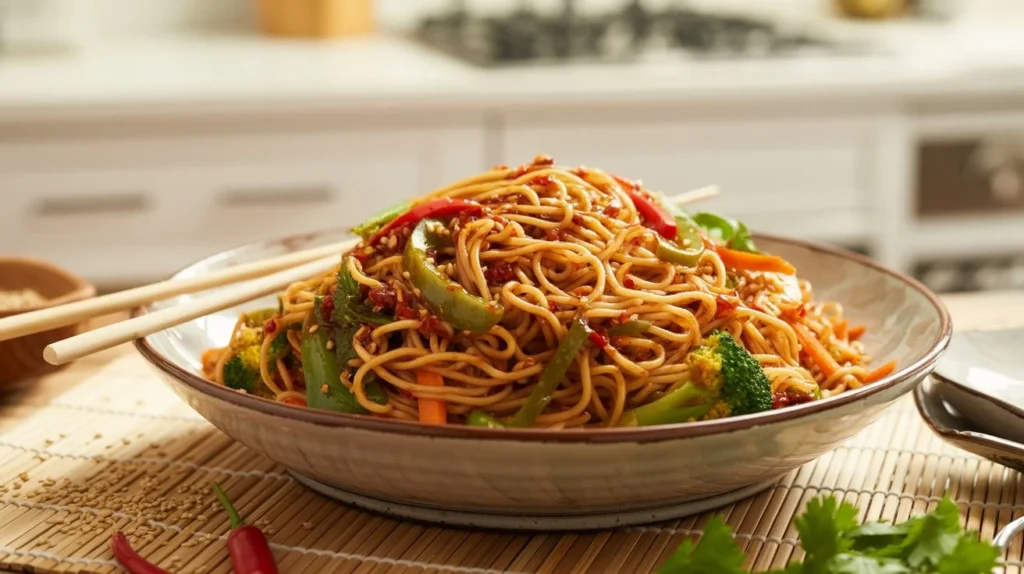 This Asian-inspired noodle recipe is ready in just over 20 minutes, making it perfect for busy weeknights. It’s a tasty way to use up leftover veggies in your fridge, and the portion size is ideal for two.