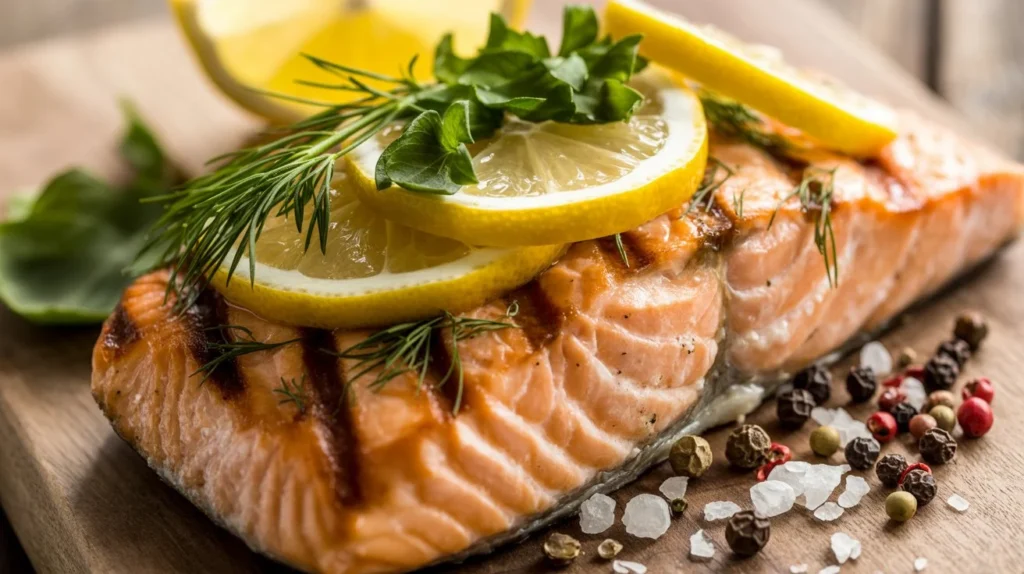 Simple yet elegant, this grilled salmon is brushed with olive oil, sprinkled with herbs, and ready in just 15 minutes. It’s perfect for a quick weeknight dinner or a special occasion.