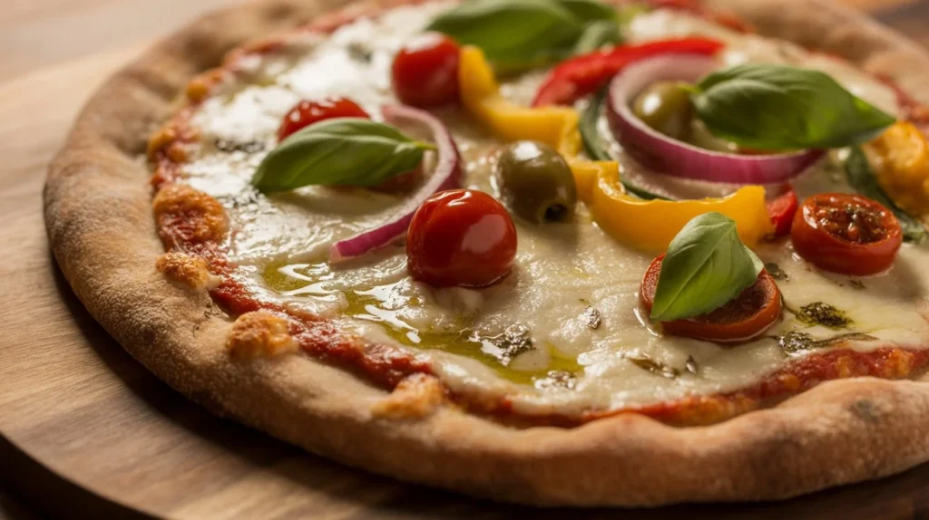 Using whole wheat dough for added nutrition, this specialty pizza is brushed with garlic, oregano, and lemon-infused oil instead of tomato sauce, then topped with mozzarella and assorted veggies.