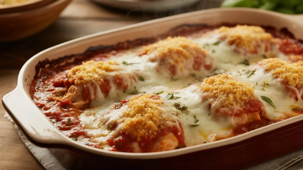 This simplified version of chicken Parmesan skips the breading and frying, making it healthier and easier to prepare. You get all the ooey-gooey cheese, crispy breadcrumb topping, and plenty of tomato sauce in a family-friendly casserole format. It’s comfort food made lighter!