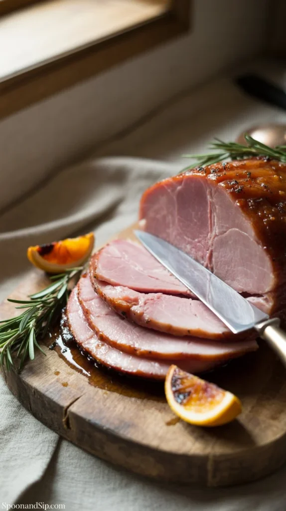 Los profesionales nunca cocinan jamón frío directo del refrigerador. Permite que el jamón alcance temperatura ambiente durante 1-2 horas antes de cocinar para cocción uniforme. Cubre el jamón con papel aluminio durante la mayor parte de la cocción para retener humedad, retirando el aluminio solo los últimos 30-45 minutos para dorar y caramelizar el glaseado.