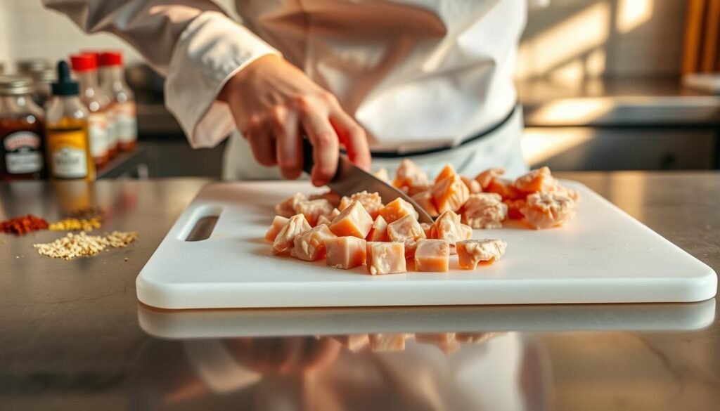 When making chicken nuggets, it’s key to handle and store the chicken right. This keeps it safe to eat. Always keep it cold, at 40°F (4°C) or below. Use it within a day or two after buying.