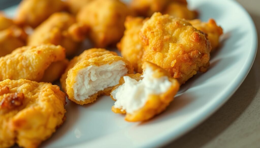 To get a crispy coating, don’t stir the nuggets too much. This helps the coating get crunchy. After cooking, put the nuggets on a paper towel-lined plate to drain oil. Serve them hot with your favorite sauce.