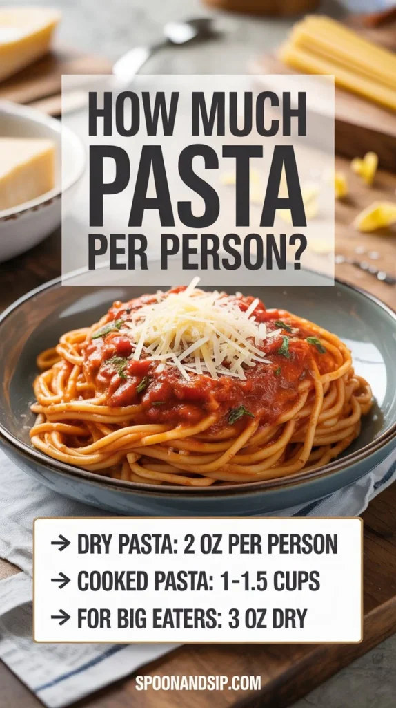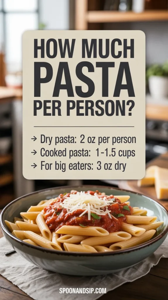 For most American households serving pasta as dinner, 3 oz dry per person is the sweet spot — satisfying without waste. That’s 3/4 of a standard 1 lb box for 4 people.